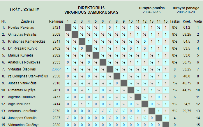 2004 metų vasario 10 dieną startavo XXIV Lietuvos korespondencinių šachmatų čempionatas. Jame žaidė šachmatais 15 dalyvių elektroniniu paštu. Žaidėjų reitingo vidurkis 2377, aukščiausias – 2509. Čempionato direktorius – Virginijus Dambrauskas.
